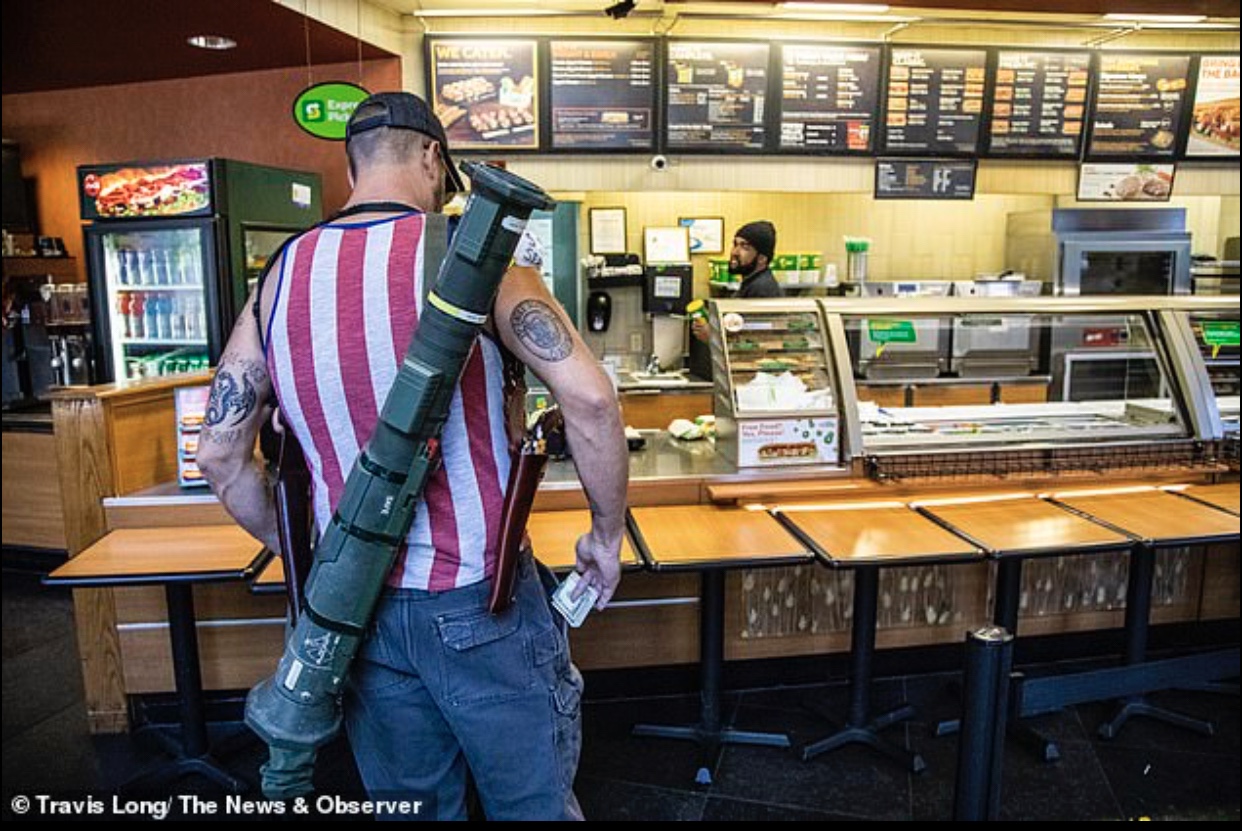 11 هٿياربند مظاهرين جو هڪ گروپ رلي ، اتر ڪيولينا ۾ هڪ سب وي تي راڪيٽ لانچر ۽ وڏي پيماني تي رائفلون کڻي خريداري ڪندي ڏٺو ويو.