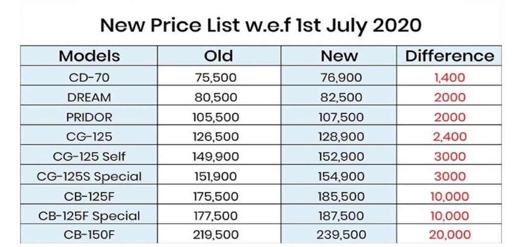 هونڊا جي موٽر سائيڪلن مان هڪ ٻي ، CG-125 ، جي قيمت 2.400 روپيا وڌي آهي. اھا موٽر سائيڪل هاڻ128900 روپيا آهي. انهي جي سیلف اسٽارٽ بائیڪ جي قيمت پڻ 3000 روپين وڌي ڪري ھاڻ 152،900 رپيا ڪئي وئي آهي.